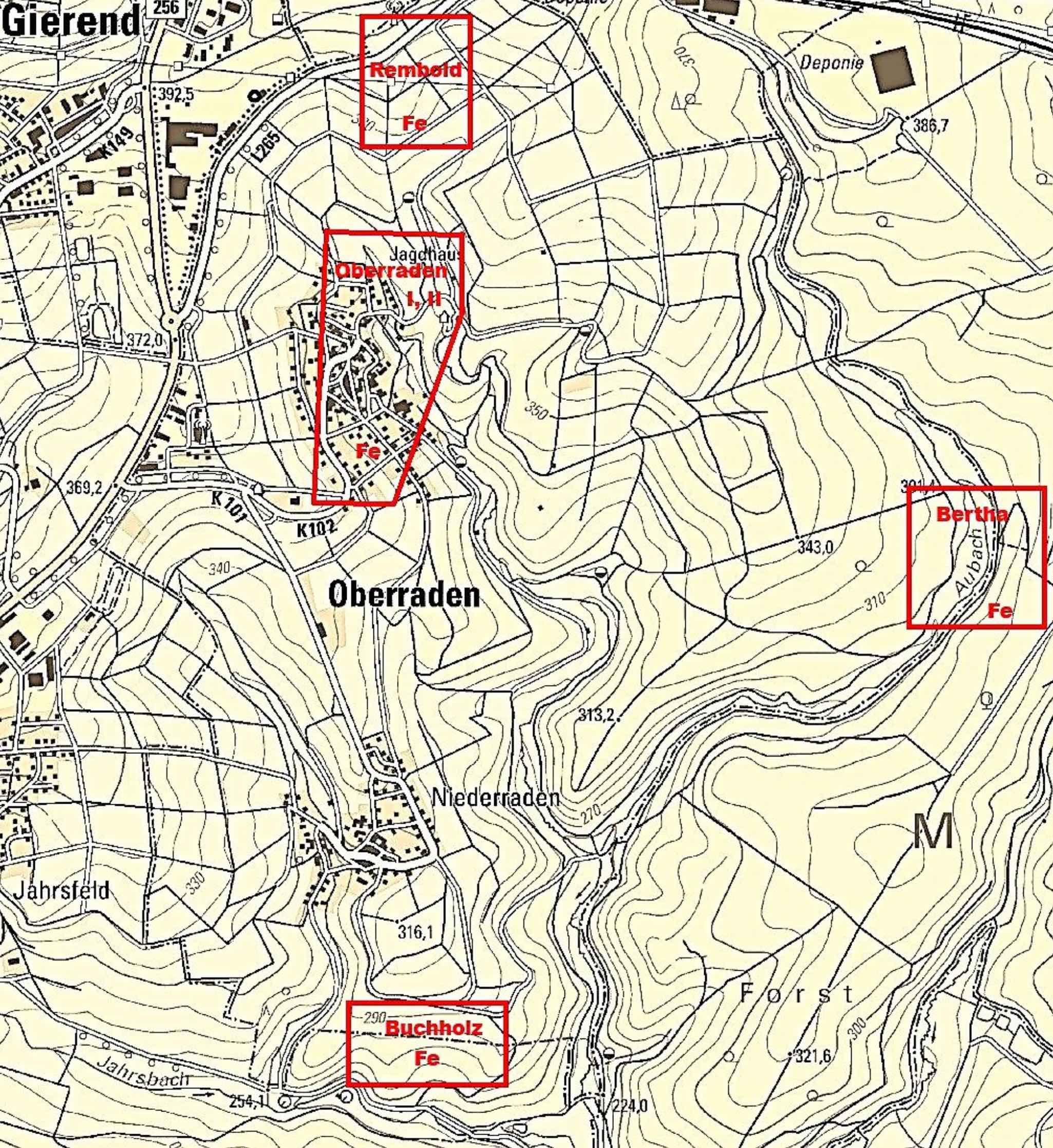 In den Gemarkungen von Nieder- und Oberraden konnten in der zweiten Hälfte des 19. Jahrhunderts verschiedene Lagerstätten von Eisenerz aufgespürt werden. Fand jemand Anzeichen auf Eisenerz, so musste er „Mutung einlegen“ , d. h. die Abbauerlaubnis beantragen. Die zuständige Bergbaubehörde – zu jener Zeit das Königliche Oberbergamt Bonn – konnte ihm dann das Abbaurecht verleihen.